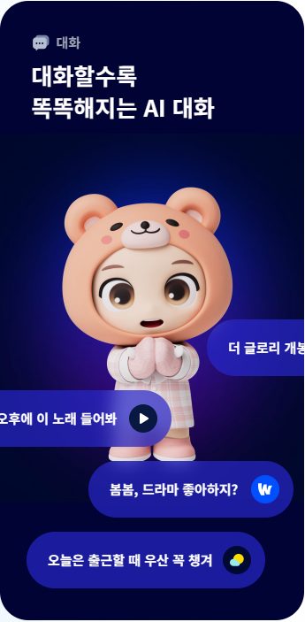 에이닷 프렌즈 기능을 통해 다양한 페르소냐를 가진 AI 친구들과 대화를 나눌 수 있습니다. 독특한 캐릭터로 구성된 페르소나들을 통해 자연스러운 감성대화를 느낄 수 있습니다. 기존의 기계적인 대화가 아닌 좀 더 몰입감 있는 대화가 가능하게 합니다.